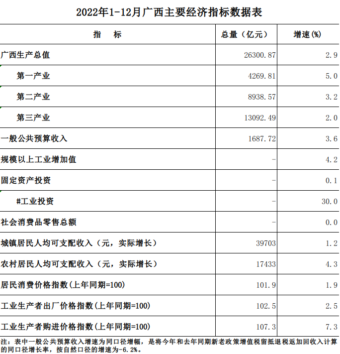 2022年1-12月广西主要经济指标数据表