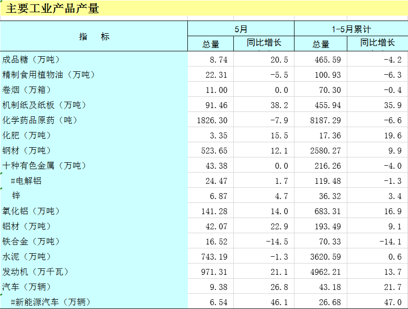 2025年1-5月广西主要工业产品产量