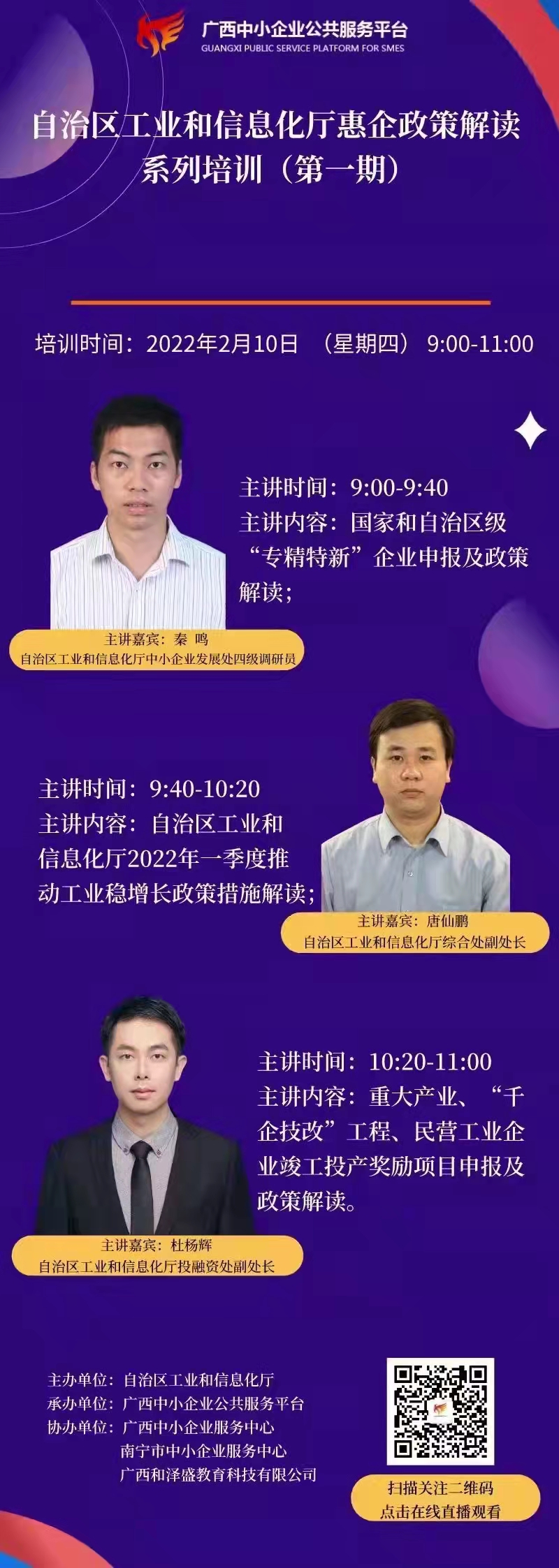 自治区涩涩视频 惠企政策解读系列培训(第一期)将于2月10日(本周四)09:00开播!