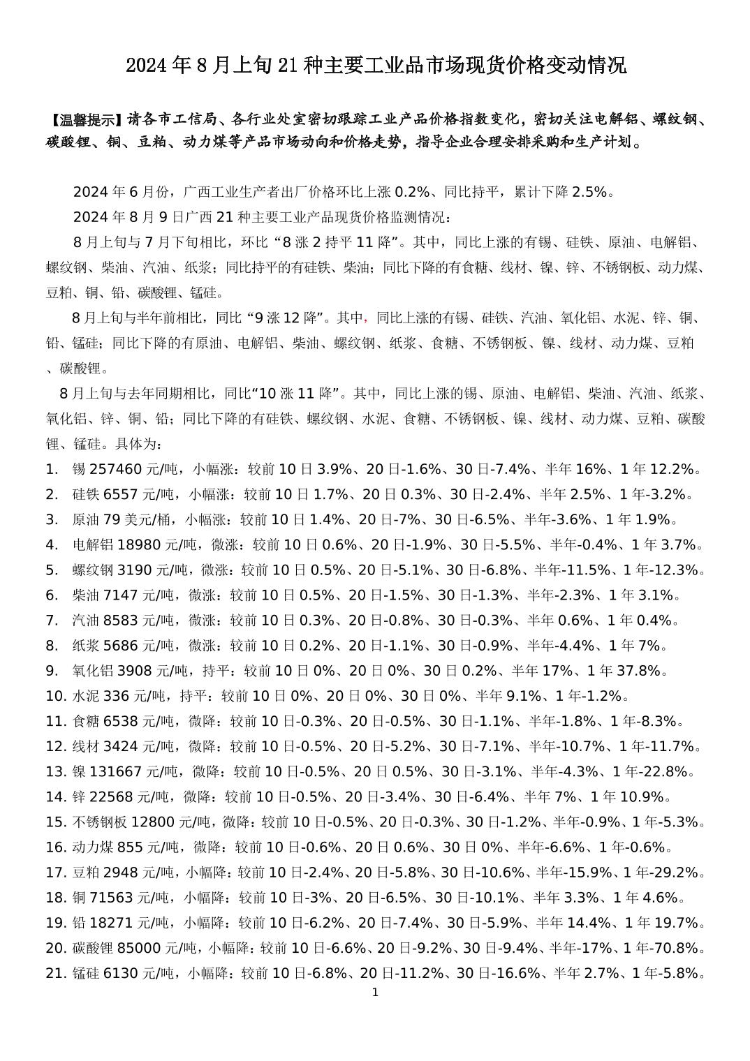 2024年8月上旬21种主要工业品市场现货价格变动情况