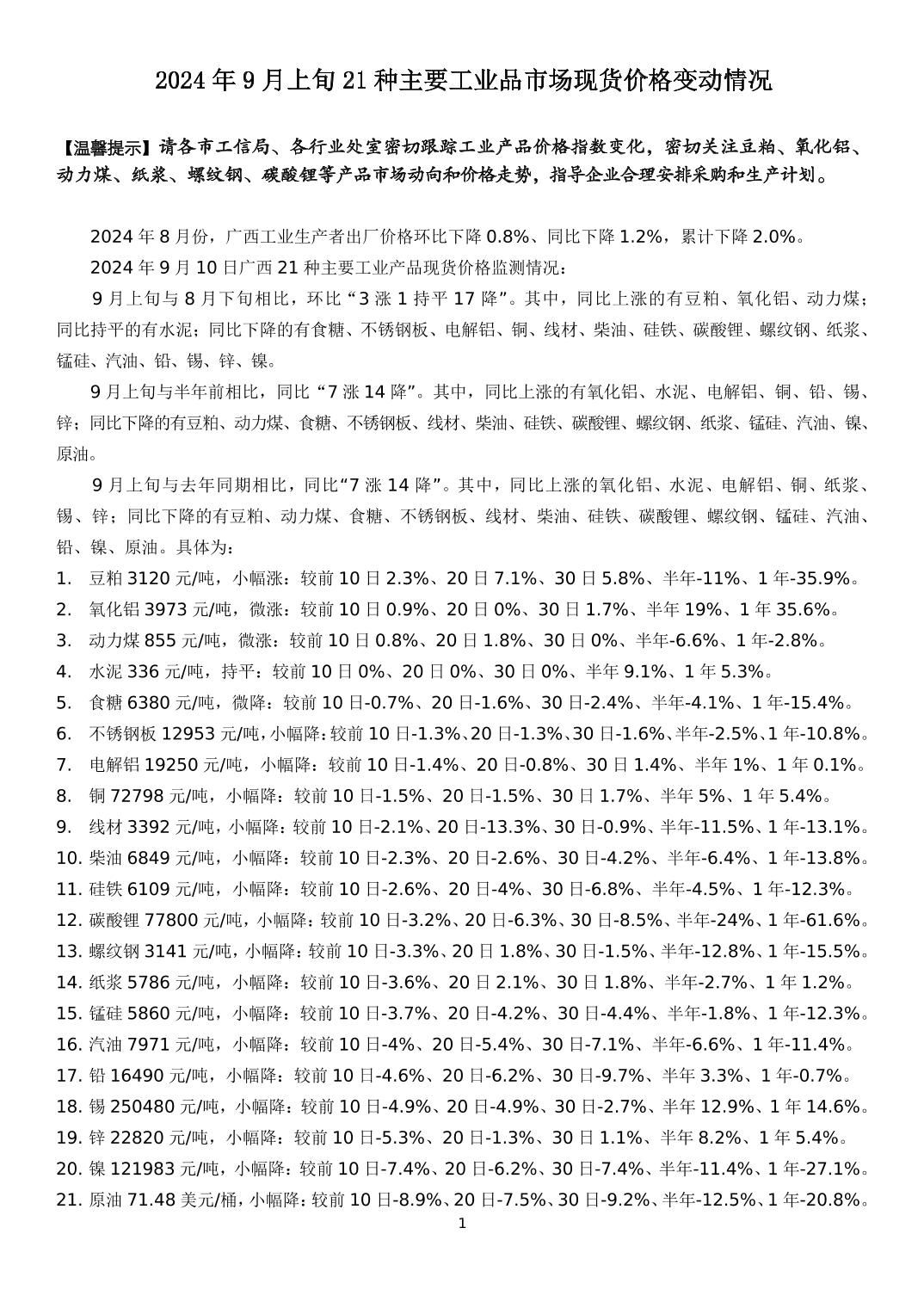 2024年9月上旬21种主要工业品市场现货价格变动情况 - 工业产品价格行情 - 涩涩视频-涩涩视频网站入口 网站