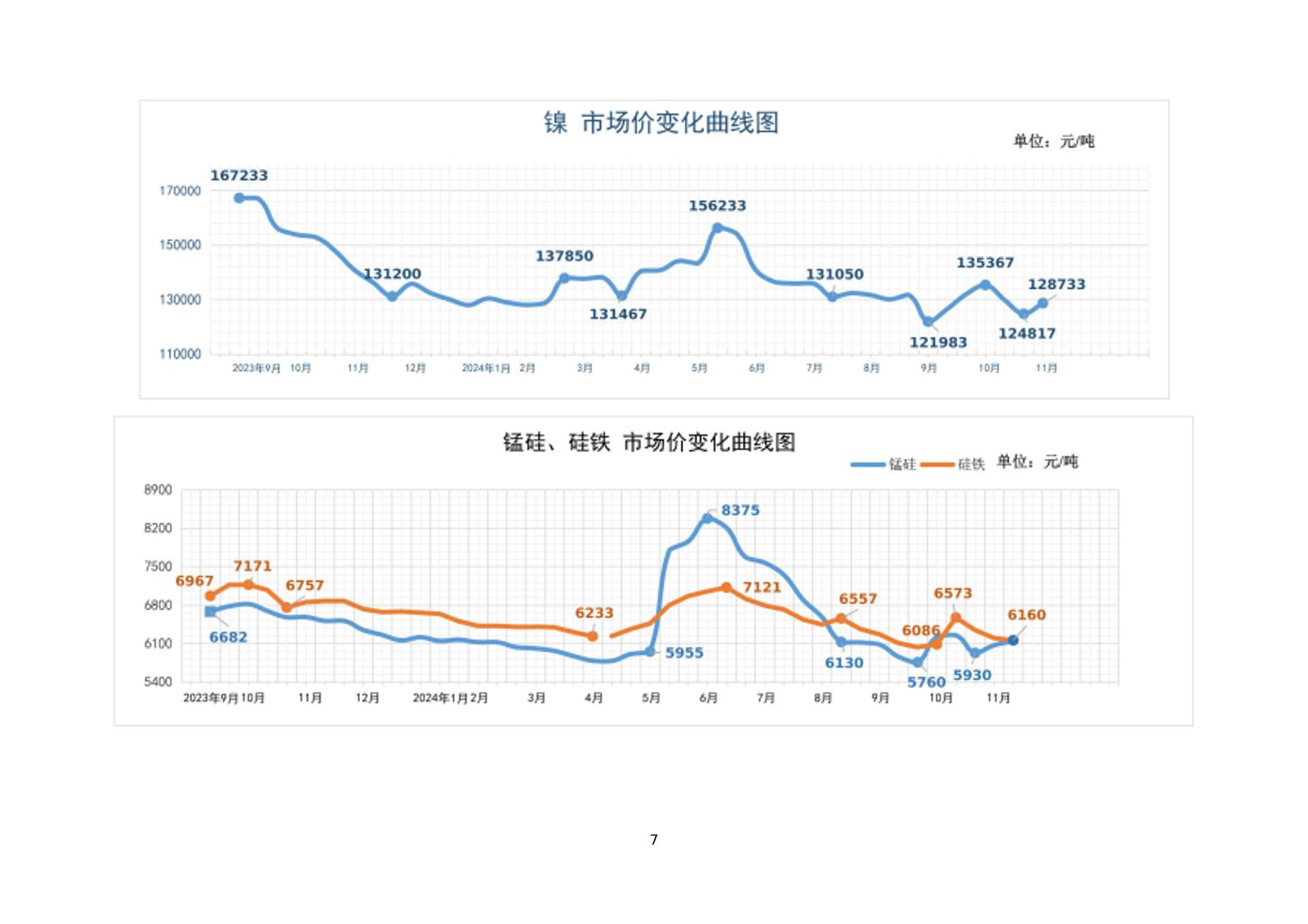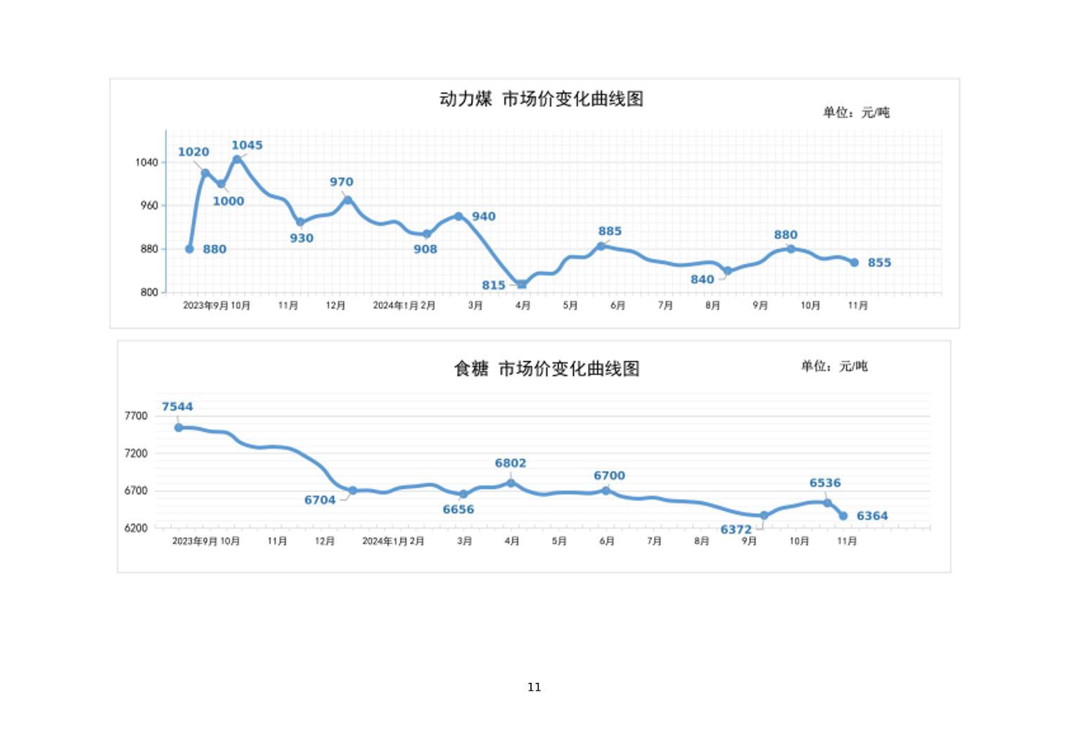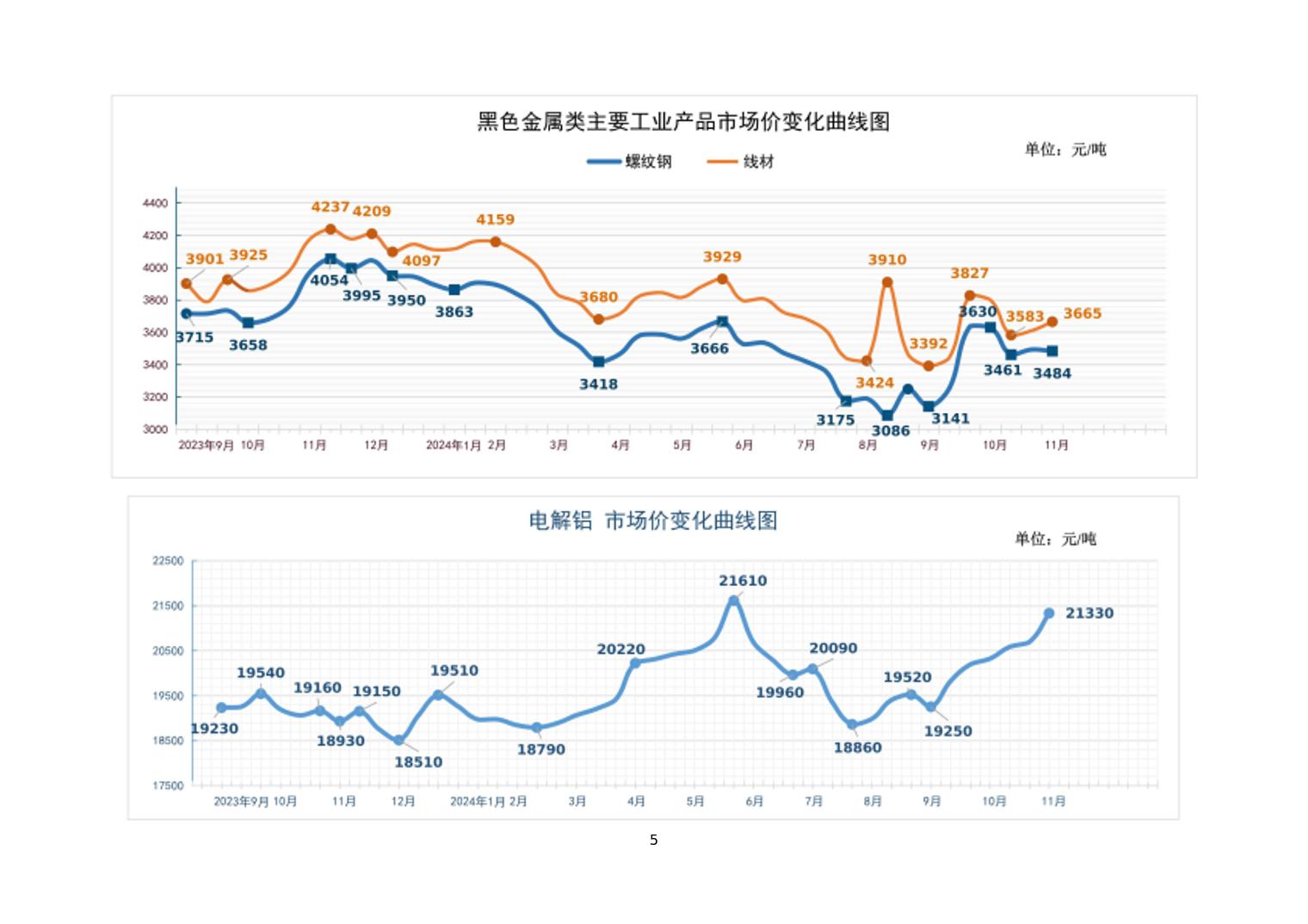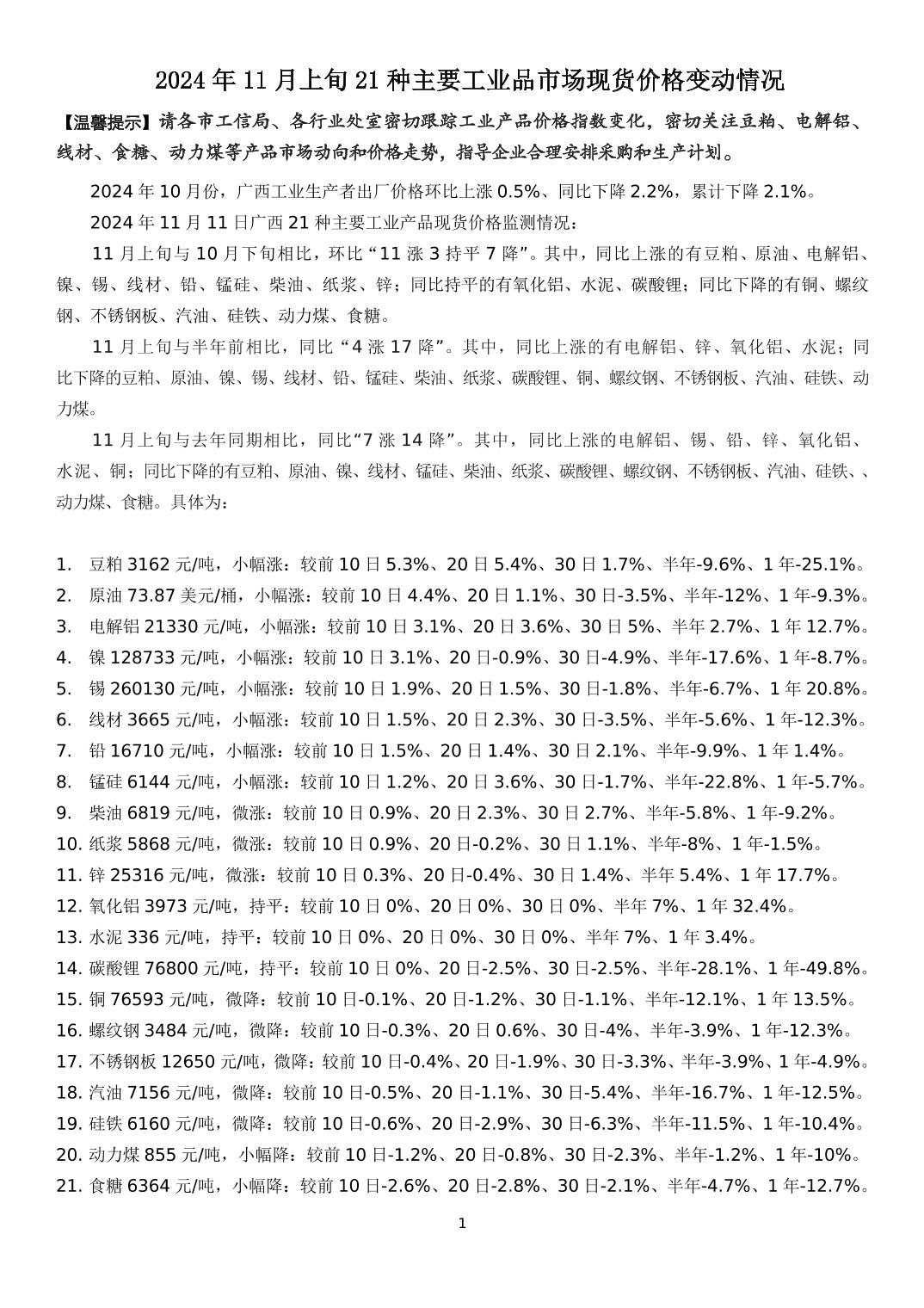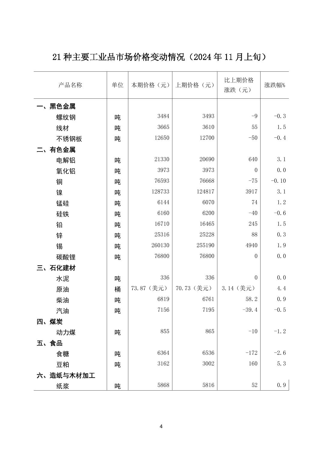 2024年11月上旬21种主要工业品市场现货价格变动情况