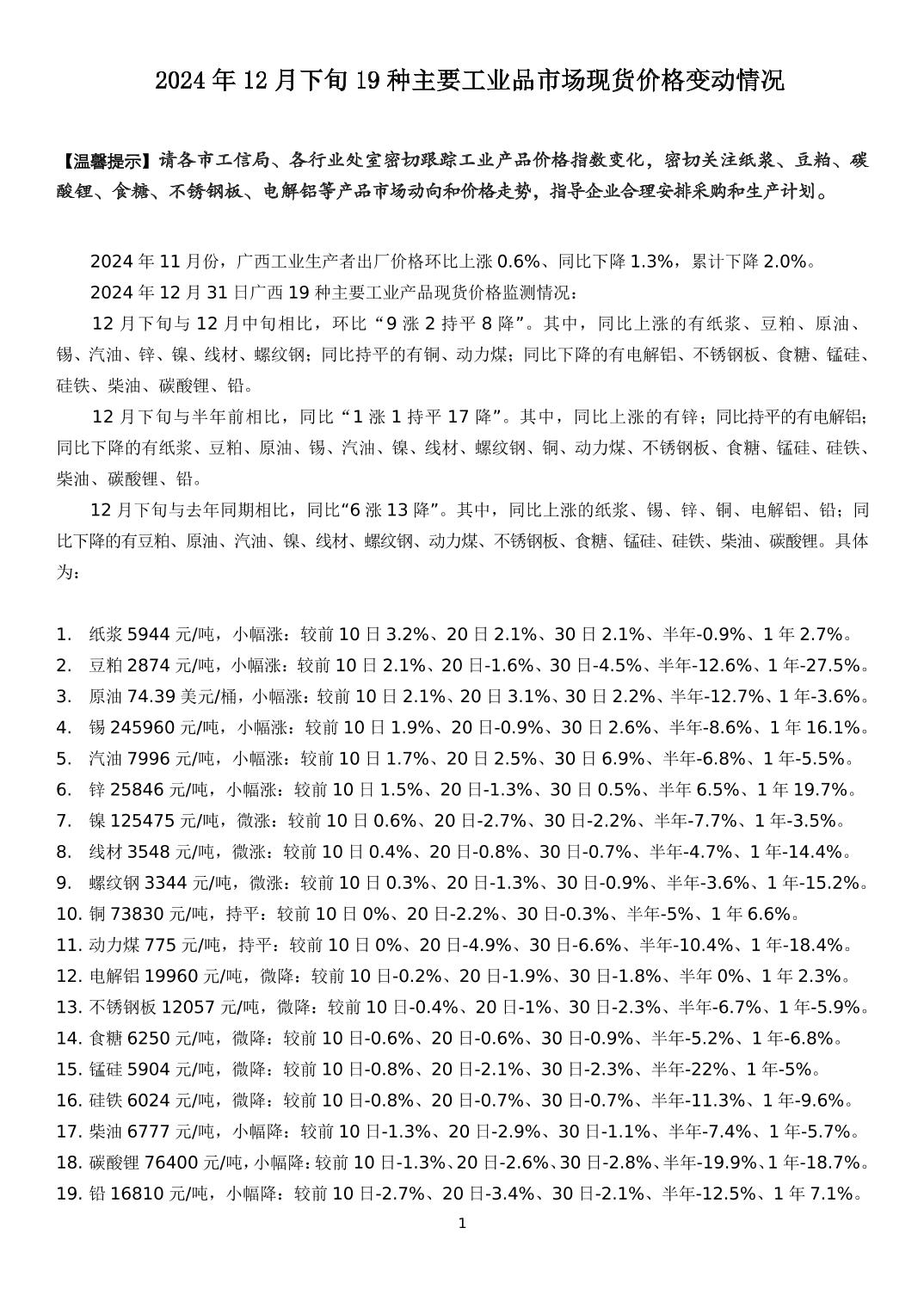 2024年12月下旬19种主要工业品市场现货价格变动情况