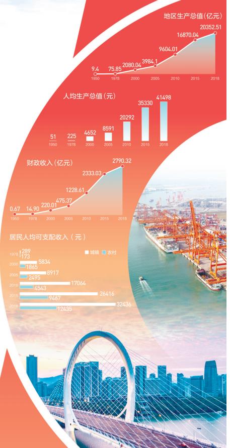 沧桑巨变七十载,八桂大地换新颜。新中国成立70年来,在党中央的坚强领导下,广西各族人民团结奋斗、砥砺奋进,从贫困落后走向繁荣振兴,从偏远封闭走向开放前沿,从温饱不足走向全面小康,全区生产总值、财政收入、人均生产总值、外贸进出口总额分别由1950年的9.4亿元、0.67亿元、51元和428万美元提高到2018年的20352亿元、2790亿元、41498元和623亿美元,壮乡大地发生了翻天覆地的变化,谱写了祖国南疆繁荣稳定的壮美华章。