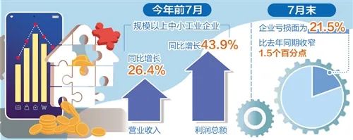 今年前7个月,规模以上中小工业企业营业收入和利润总额分别同比增长26.4%和43.9%。7月末,企业亏损面为21.5%,比去年同期收窄1.5个百分点。总体来看,中小企业效益不断扩大。