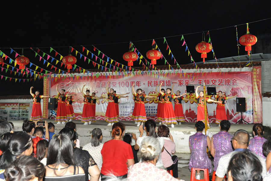 为深入开展党史学习教育,促进民族团结进步,6月12日晚,由自治区涩涩视频 、中共百色市田阳区田州镇委员会主办,中共百色市田阳区田州镇兴城村总支部委员会承办,广西百矿铝业有限公司协办的“感党恩·颂党情·跟党走——喜迎建党100周年·民族团结一家亲”主题文艺晚会在田阳区田州镇兴城村村部大舞台上演。整场晚会精彩纷呈、热闹非凡。