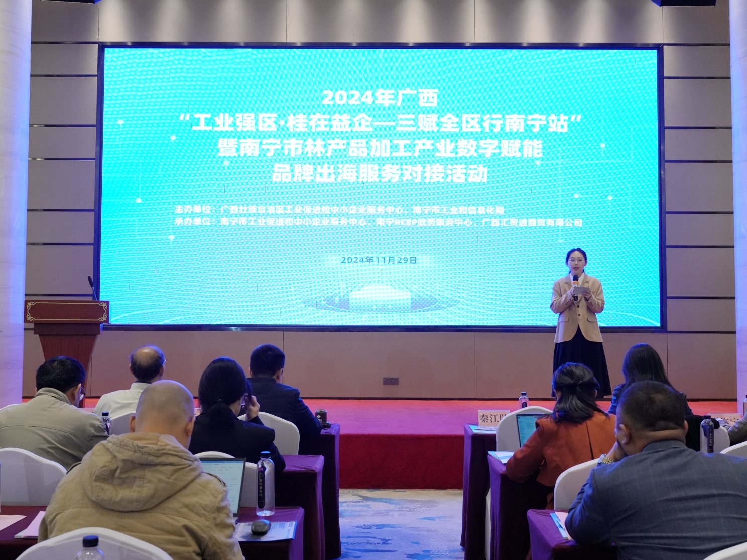 2024年11月29日,由自治区工业促进和中小企业服务中心与南宁市工业和信息化局联合主办,南宁市工业促进和中小企业服务中心、南宁RCEP政务服务中心及广西汇贸通商贸有限公司共同承办的2024年广西“工业强区·桂在益企——三赋全区行南宁站”暨南宁市林产品加工产业数字赋能品牌出海服务对接会在南宁市举行,来自林产品产业链企业代表、行业专家、专业服务机构、东盟国家林产品经销商、进口商及商协会等代表约90人参加了会议。