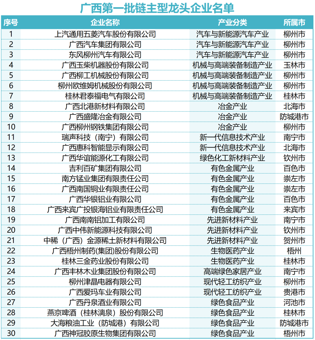 链主型龙头企业,作为产业链上的“超级节点”,担负着产业生态集聚者的重任,往往能带动形成区域产业集群。广西从工业龙头企业培育库中遴选一批群链牵引力强、产出规模大、创新水平高、核心竞争力突出、市场前景广阔的链主型龙头企业,首批链主型龙头企业脱颖而出。